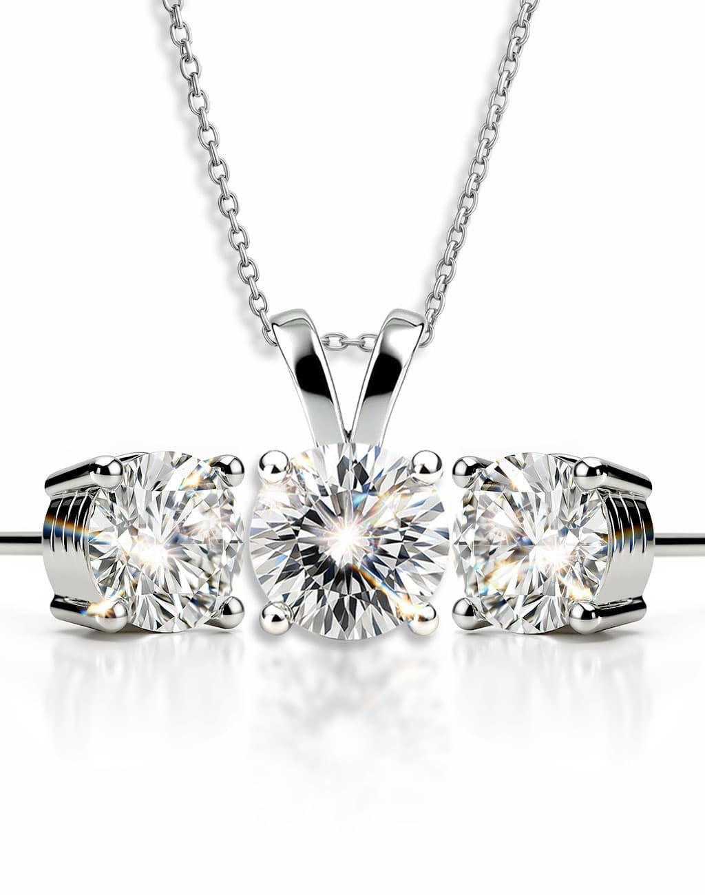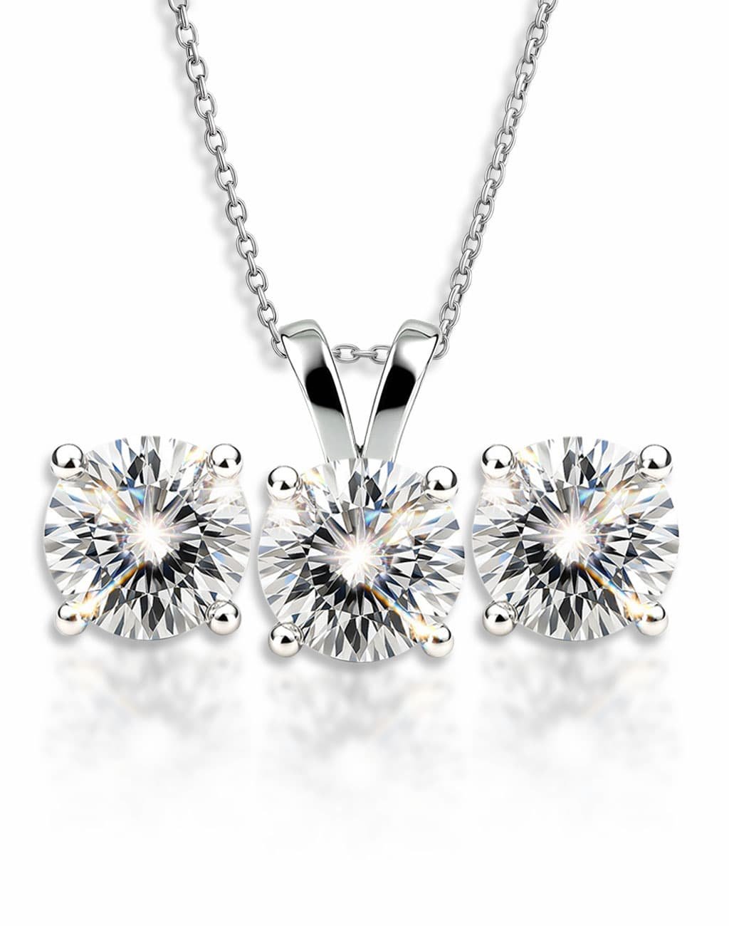 This stunning jewelry set features a pendant and matching earrings, each adorned with a fiery 1-carat moissanite stone known for its exceptional brilliance, clarity, and diamond-like sparkle. The minimalist four-prong setting allows the stone to take center stage, creating a refined and radiant look.