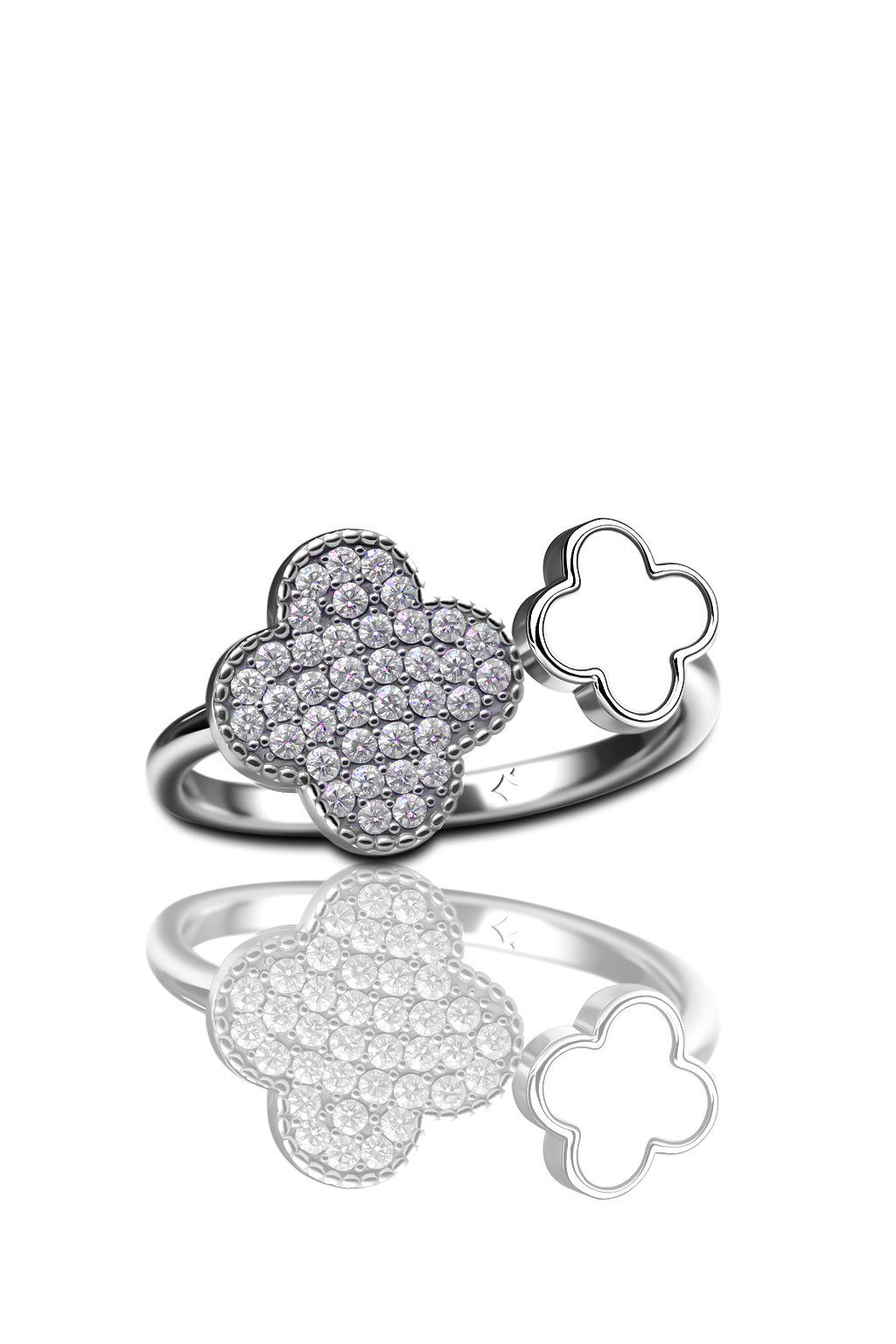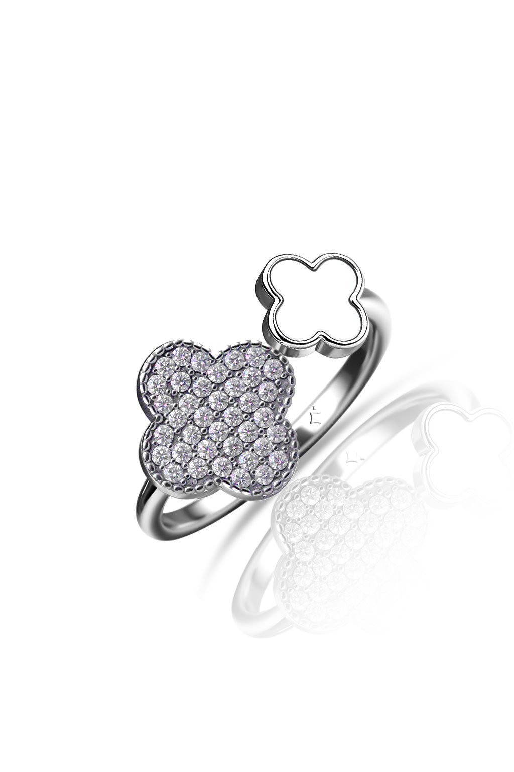 The clover design, often associated with luck and love, shines brilliantly through its finely detailed pavé setting. Handcrafted from 925 sterling silver and finished with rhodium plating, this ring promises long-lasting brilliance and durability. Whether worn solo or stacked with other rings, it complements every outfit with effortless sophistication.