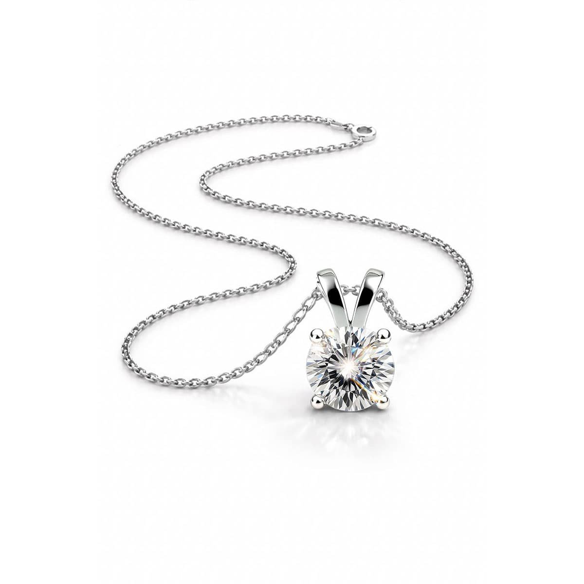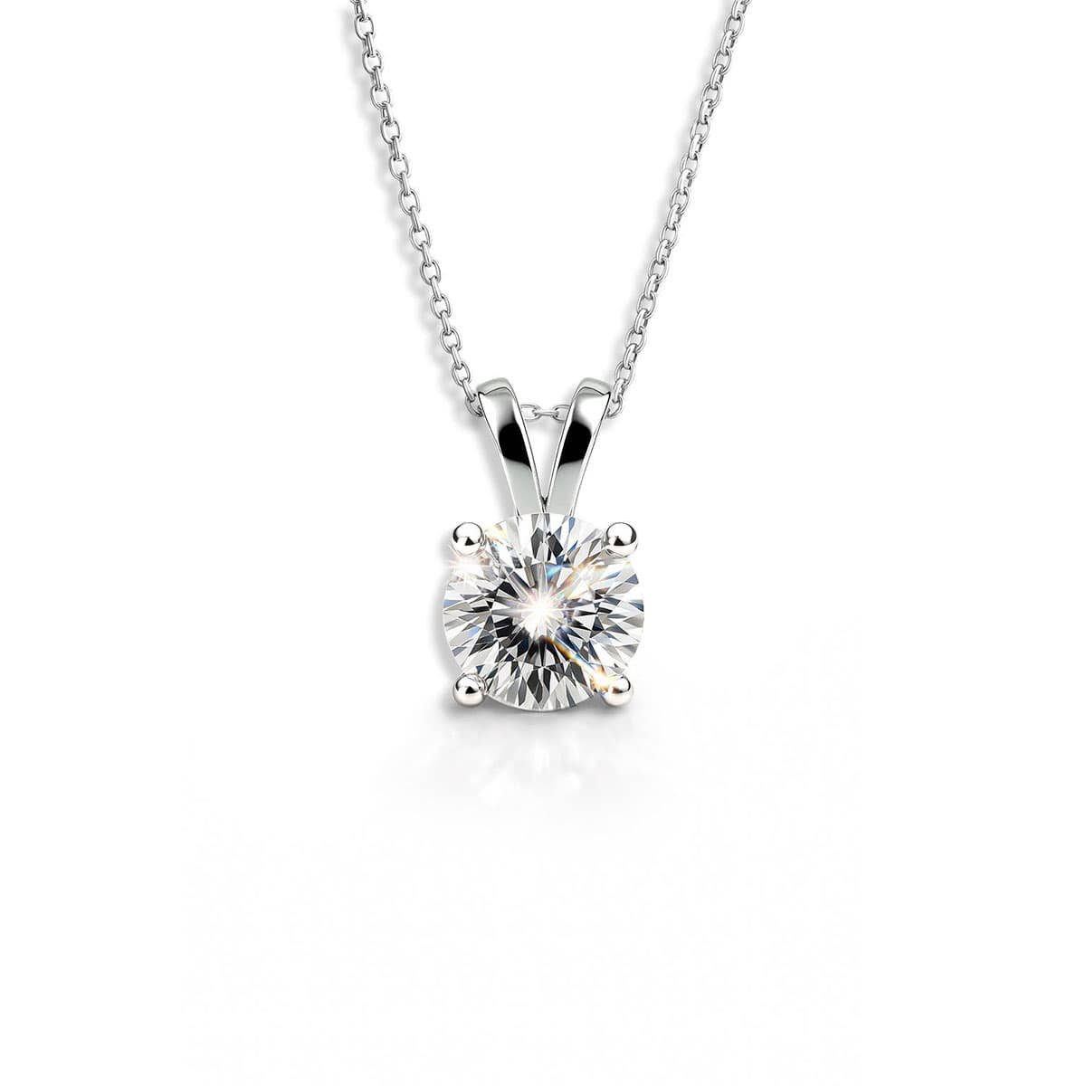 Elevate your everyday elegance with this stunning moissanite pendant necklace, showcasing a fiery 1-carat GRA Certified moissanite stone. Designed in a classic four-prong setting, the pendant is suspended from a sleek sterling silver chain rhodium-plated for durability and luster.