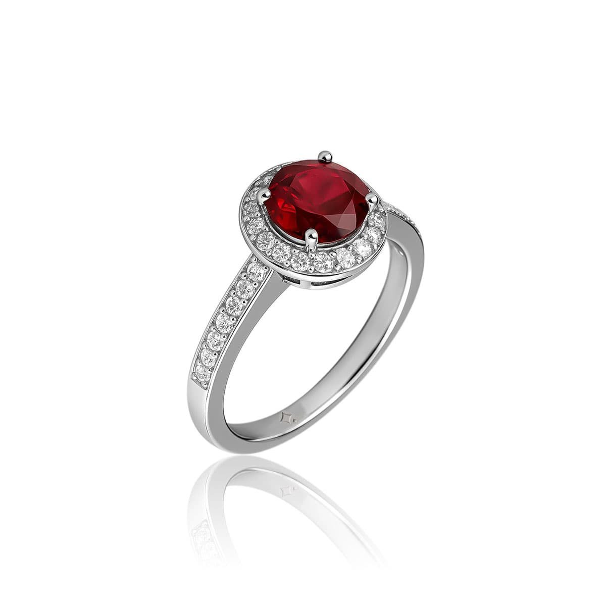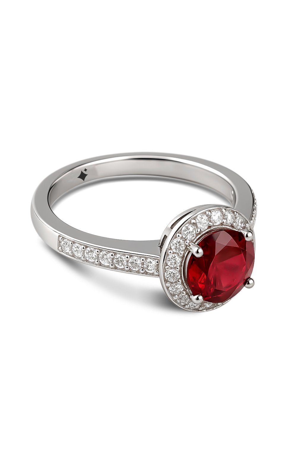 - Center Stone: Premium circle-cut ruby with vibrant red color