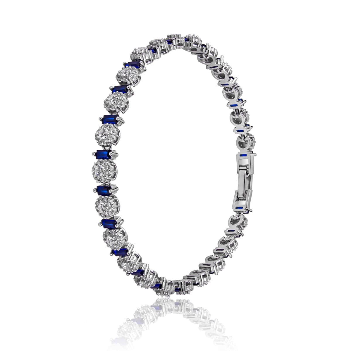 Introducing our Sapphire Cluster Tennis Bracelet – a radiant blend of brilliance and elegance. Crafted from 925 sterling silver, this exquisite bracelet features alternating clusters of sparkling zircon stones and deep sapphire baguettes. Each link is polished to perfection, reflecting timeless sophistication and luxury. Ideal for evening wear or gifting someone special.